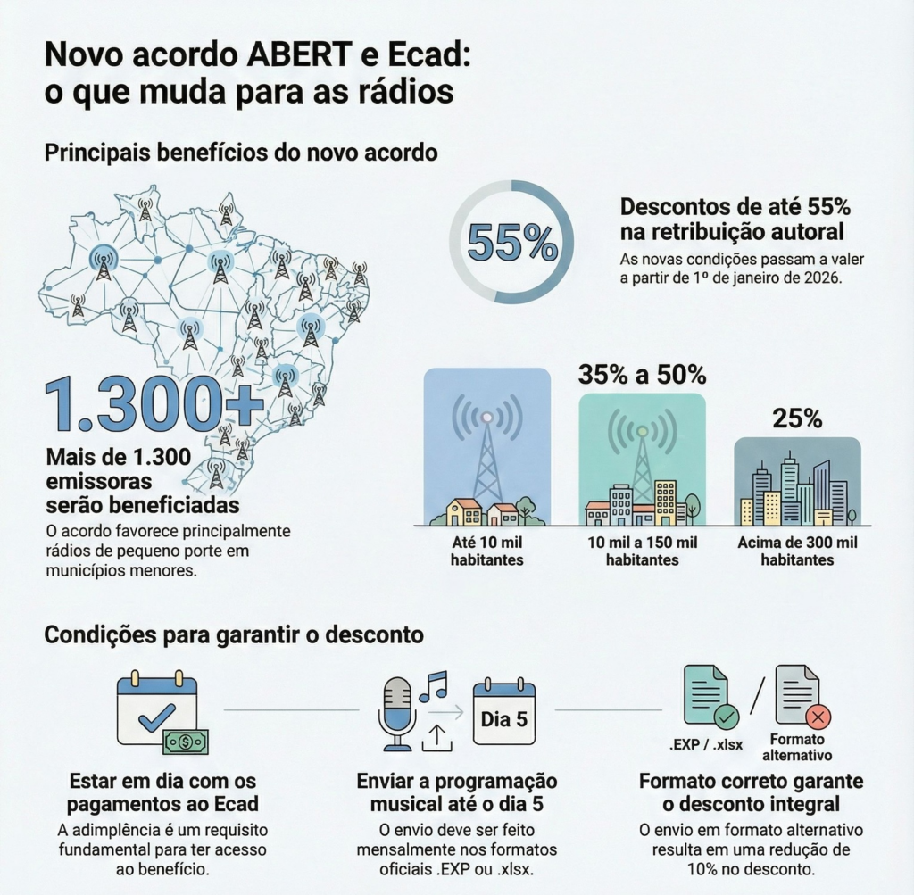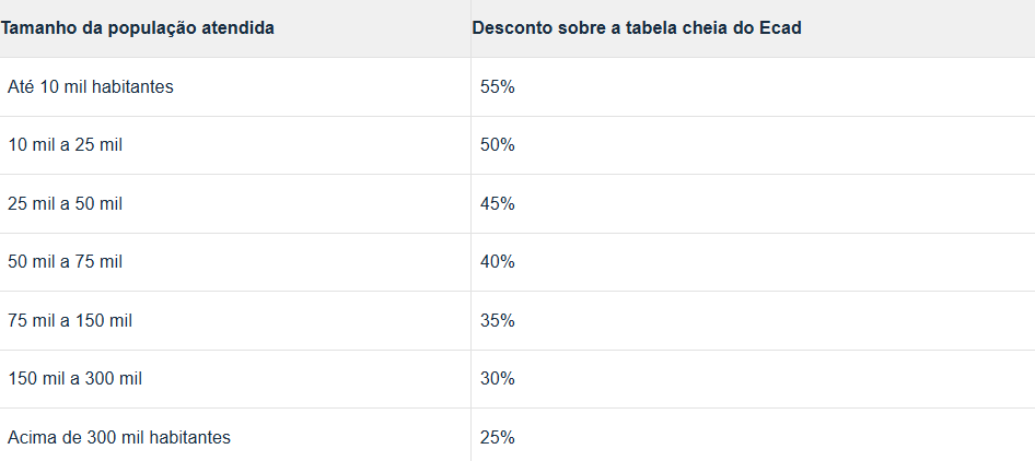 O convênio mantém autorização para que rádios associadas usem obras musicais — mediante pagamento mensal da retribuição — e agora reduz os valores cobrados de acordo com o porte da população atendida. A tabela de descontos foi dividida por faixa populacional: